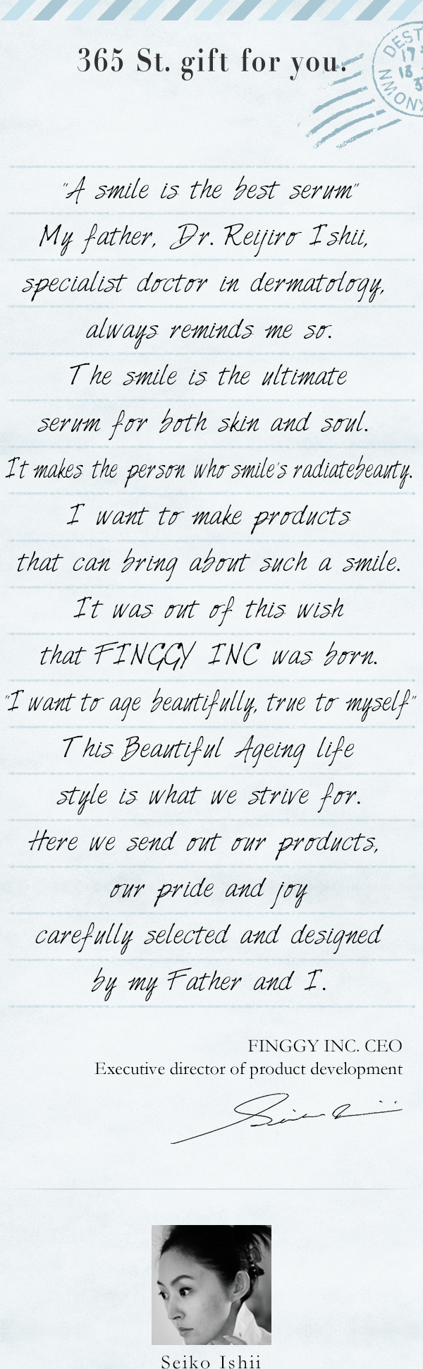 On the 25th of December 2012, on the holy day, the talented Seiko Ishii’s new cosmetic brand was born. FINGGY INC. raises ‘Beautiful Ageing’ as a banner and continues to spread the importance of ageing beautifully.